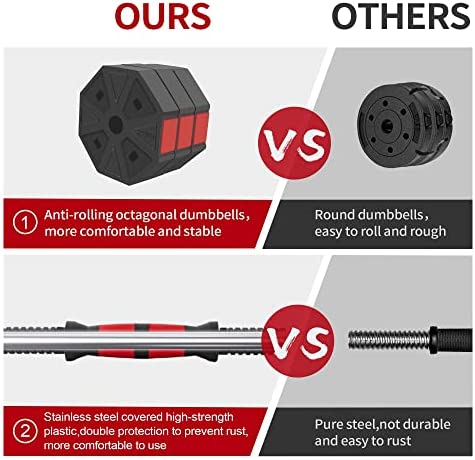 BIERDORF Adjustable Weights Dumbbells Set, Non-Rolling Adjustable Dumbbell Set, Octagonal, Home Gym Fitness Free Weight Set, 44/66 Lbs, Workout With Connecting Rod For Men Women 【Superb & Durable】- The BIERDORF adjustable dumbbell sets comprises polyethylene and EVA resin, with a cement mixture, solid and sturdy. with no damage to the floor. Elastic material increases the cushioning space and protects the floor from dumbbell injury. 【Adjustable Weights Training】- As a barbell, the weight totally up to 44 lbs, you’re free to customize the weight setting to meet the training needs. The package included: 4*1.25kg(2.75 lbs) dumbbell, 4*1.5kg(3.3 lbs) dumbbell, 4*2kg(4.4 lbs) dumbbell, 1*connertor, 2*dumbbell bar, 4* non-slip nut. 【The Benefits of Dumbbell Exercise】- The multi-weight one-piece design of dumbbells is very suitable for specific part and whole body exercises, bringing benefits such as building muscles, burning calories, improving cardiovascular and eliminating strength imbalances for your body and mind. 【Please Read】- 99% of our customers will not choose to contact us because our weights dumbbells set are made with perfect materials and workmanship. If you need to know more, please feel free to contact me, engineers are always online! Now you can buy BIERDORF weight set.