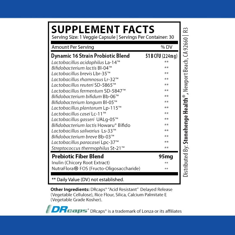 Per Serving (1 Capsule): 3 mg Vitamin C, 0.38 mg Iron; 21 mg Proprietary Probiotic Blend: Lactobacillus acidophilus, L. rhamnosus, L. plantarum L. salivarius, L. casei, L. brevis, Streptococcus thermophilus, Bifidobacterium bifidum, B. lactis, B. longum, Saccharomyces boulardii and Bacillus coagulans; 80 mg Proprietary Enzyme Blend: 12,500 HUT Protease, 2,500 CU Cellulase, 250 U Chitosanase, 5,000 SPU Serrapeptase; Proprietary Prebiotic & Herbal Blend: Fructooligosaccharides, Alfalfa (leaf, stem), Papaya Juice, Fulvic Acid & Ionic Minerals. Other Ingredients: Maltodextrin‡, Hypromellose.